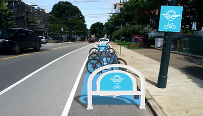 Clear, bright blue corrals near sidewalks or bike lanes make parking areas easy to identify from a distance. Directional arrows guide proper parking for efficient space use, while a simple docking system keeps bikes upright during wind or storms. This low-cost solution improves safety, reduces damage, and extends bike lifespan.